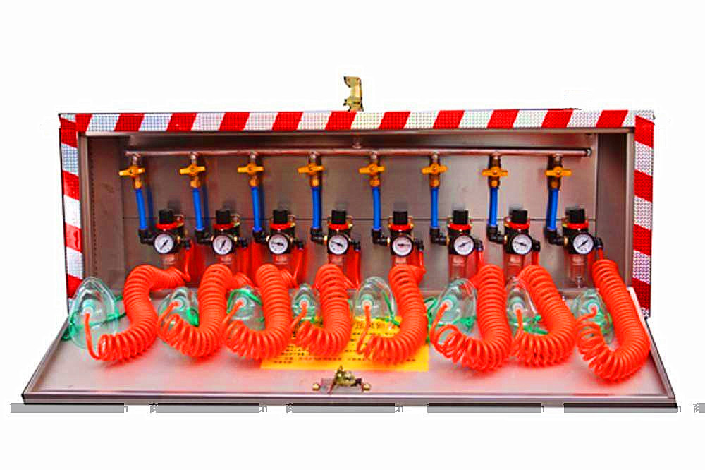該自救器主要用于具有煤與瓦斯突出的煤礦井下救災防護。箱式壓風(fēng)自救裝置安裝在煤礦井下銅室或采煤工作面的機風(fēng)巷進(jìn)頭的適當位置或流動(dòng)人員較多的地方,以及溜子頭、井底車(chē)場(chǎng)、運輸和回風(fēng)巷道、各種站房等地。當發(fā)生巷道冒頂,煤與瓦斯突出時(shí)或有突出預兆時(shí),工作人員跑步進(jìn)入附近安裝有呼吸器的地點(diǎn)和場(chǎng)所避災,戴上呼吸器,等待救援。